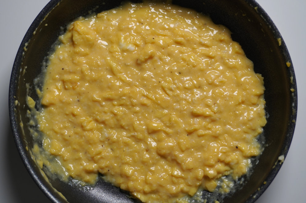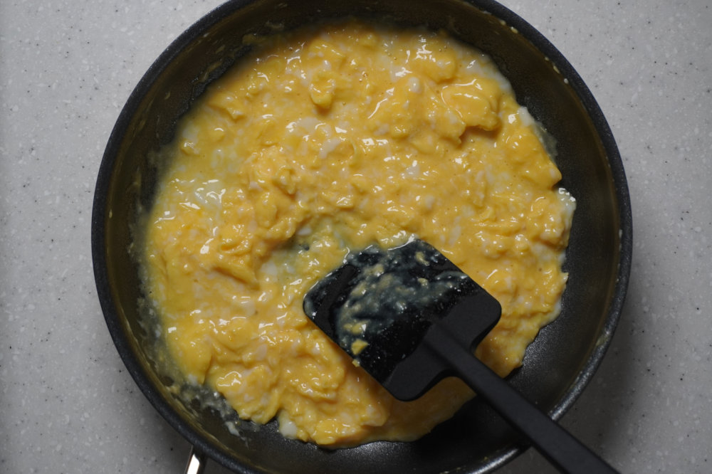 불은 중약불로 줄인다. 팬을 다시 불에 올려 30초 동안 저어주고, 다시 불에서 내려 30초 동안 젓는다. 계란이 걸쭉해질 때까지 반복한다.