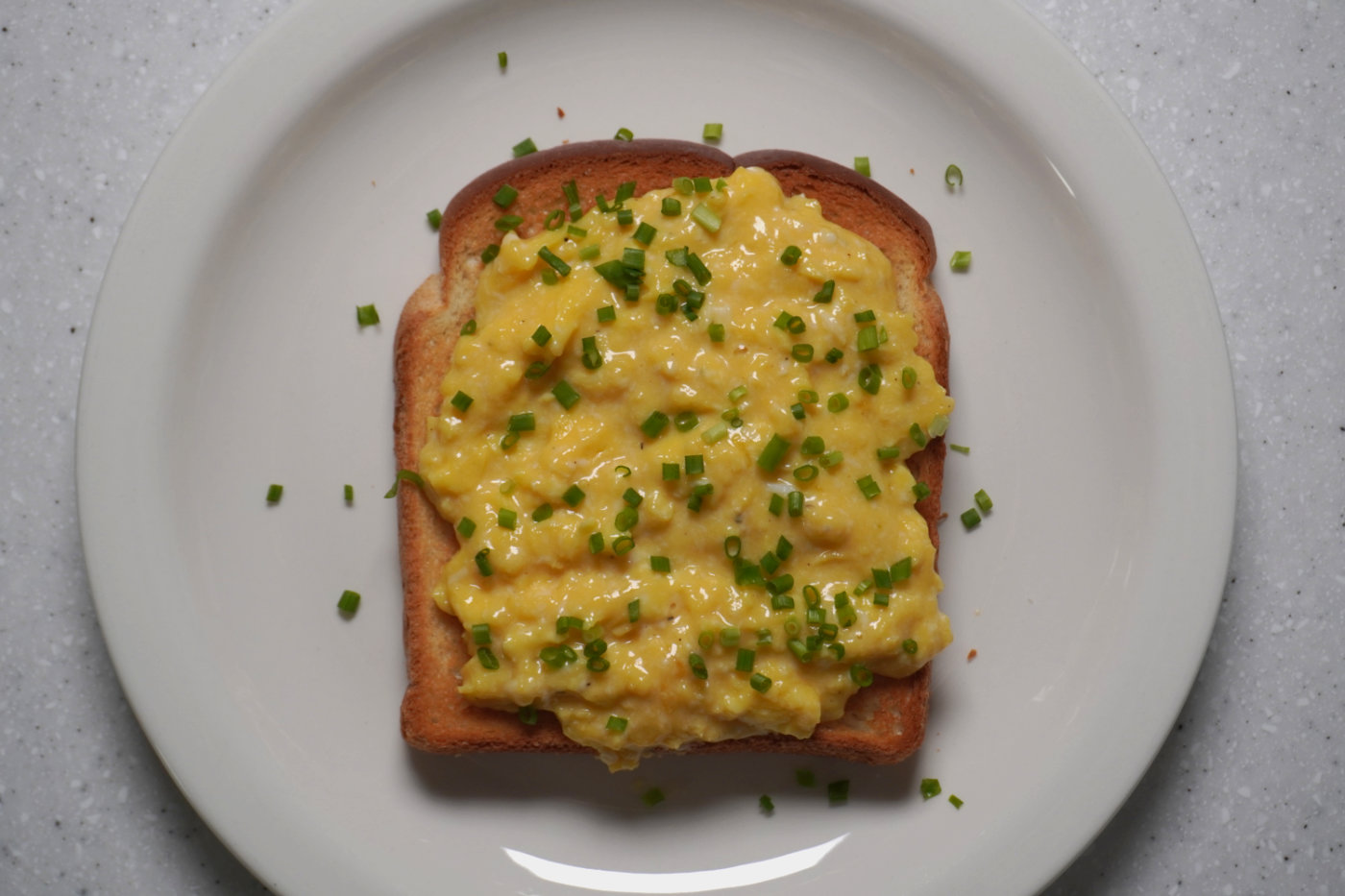 계란이 원하는 만큼 익으면, 스크램블에그를 토스트에 올리고 그 위에 차이브를 뿌린다.